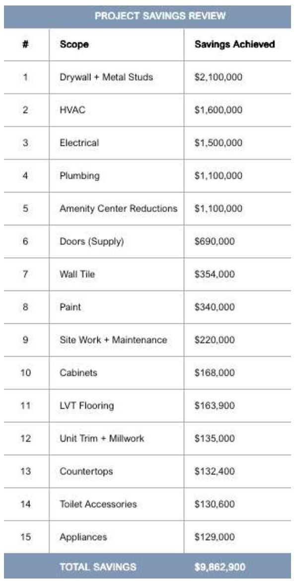 $9,862,900 in total construction savings, restoring feasibility and protecting both lender confidence and investor returns.